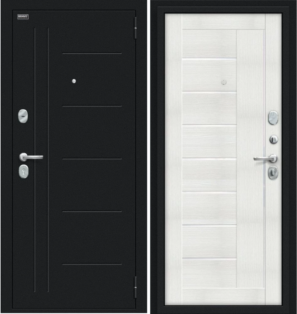 Надежная входная Дверь Браво Проф Букле черное/Bianco Veralinga премиум класса по цене 32 385 руб. Большая толщина стали защитит от проникновения в ваш дом, квартиру или коттедж. Используется очень качественная фурнитура: замки, цилиндры, ручки, защелки. Покрытие и отделка двери изготовлено под внимательным контролем производителя. Дверь имеет долгий срок службы и гарантию.