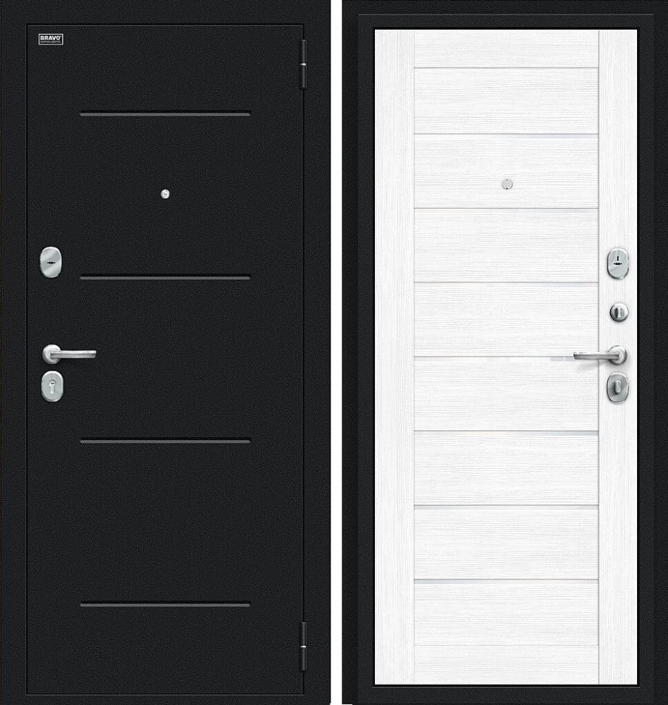 Надежная входная Дверь Браво Техно Букле черное/Snow Melinga премиум класса по цене 30 785 руб. Большая толщина стали защитит от проникновения в ваш дом, квартиру или коттедж. Используется очень качественная фурнитура: замки, цилиндры, ручки, защелки. Покрытие и отделка двери изготовлено под внимательным контролем производителя. Дверь имеет долгий срок службы и гарантию.